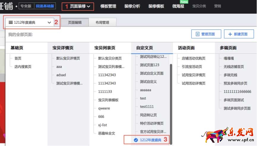 第一部:進入旺鋪裝修后臺,請點我~!→ 頁面裝修 → 點擊”頁面管理“ →自定義頁或官方預(yù)置頁 →”雙11活動承接頁“。