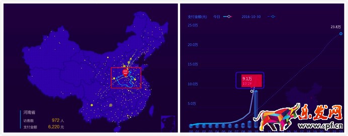 左下角省市,也就是地圖藍(lán)色圈定部分,是店鋪實時訪客top5的省市輪播,對應(yīng)左下角則會展示該省的訪客數(shù)和支付金額,訪客來源清晰直觀!