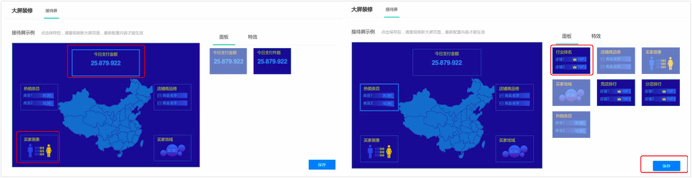 1、大屏裝修可配置大屏內(nèi)容和彩蛋特效,其中面板就是裝修大屏的頭部內(nèi)容和組件模塊。如以下截圖,分別是頭部支付金額和支付件數(shù)指的標(biāo)配置和大屏7大組件的內(nèi)容配置?! ?/p>