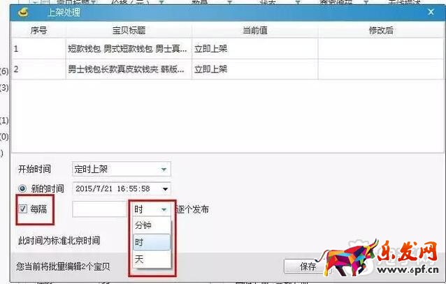 選擇間隔上架時(shí)間,選中的寶貝會按照設(shè)置的上架時(shí)間逐一上架。每一項(xiàng)都選擇好后,一定要記得保存哦!