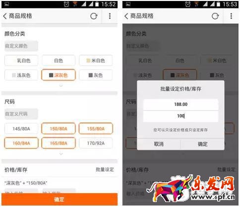 6、不同的商品,會(huì)有不一樣的屬性。以服裝為例、選擇好顏色、尺碼之后,可以點(diǎn)擊“批量設(shè)定”價(jià)格與庫(kù)存,這樣就不用一一進(jìn)行輸入了。