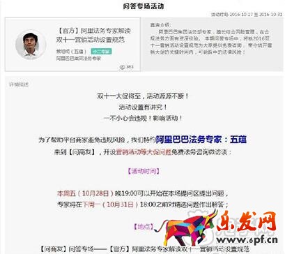 1、雙十一大促將至,各種活動源源不斷,淘寶為了幫助平臺賣家規(guī)避風險,特設【問答專場活動】,邀請阿里巴巴集團法務專家在【問商友】板塊就營銷活動等大促問題進行免費法務咨詢,有問題的商家們可前往提問。