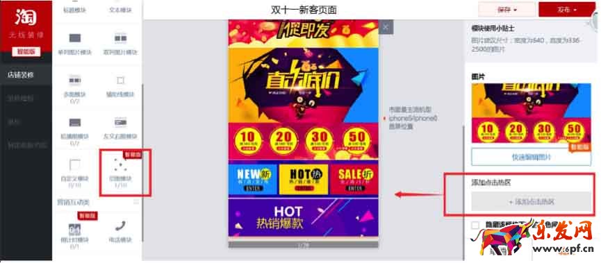 在詳情頁(yè)布局時(shí)建議大家點(diǎn)擊右上角的模板管理按鈕,建議設(shè)計(jì)好自己的模板,不要用官方模板。這里還有一個(gè)十分方便的熱點(diǎn)鏈接功能,我們可以在海報(bào)里框出任何區(qū)域鏈接到我們想要鏈接的頁(yè)面。