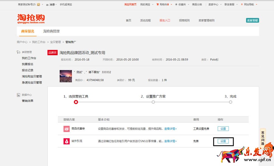 (1)設(shè)置路徑:淘搶購門戶——點(diǎn)擊進(jìn)入報名按鈕——報名記錄/淘搶購寶貝管理——操作欄選“營銷推廣“——選點(diǎn)“站外引流”營銷工具——操作欄點(diǎn)擊“設(shè)置”。
