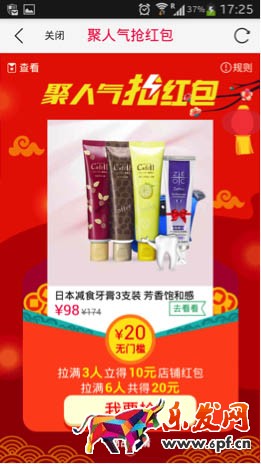 “站外引流--聚人氣”玩法概述:參加淘搶購商家審核通過獲得排期后可設(shè)置淘搶購店鋪紅包,淘搶購店鋪紅包可用于購買店鋪中的所有商品(且訂單中必須包含參加淘搶購活動的商品)、優(yōu)惠不計入天貓、聚劃算、淘搶購最低價; 設(shè)置好以后,從預(yù)熱期開始在無線的相關(guān)頁面即會展示紅包信息,供用戶搶領(lǐng);用戶搶領(lǐng)到的是紅包任務(wù),還須去做任務(wù)即分享拉人,當(dāng)拉齊3人才可搶得1個淘搶購店鋪紅包、拉齊6人可再搶得1個,同店鋪每用戶最多搶得2個紅包。