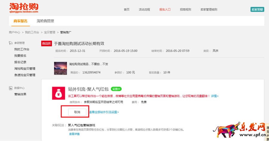 2)設(shè)置路徑: 淘搶購門戶——點(diǎn)擊進(jìn)入報名按鈕——報名記錄/淘搶購寶貝管理——操作欄點(diǎn)擊“營銷推廣”——選點(diǎn)“站外引流”營銷工具——操作欄點(diǎn)擊“查看”——點(diǎn)擊“取消”。