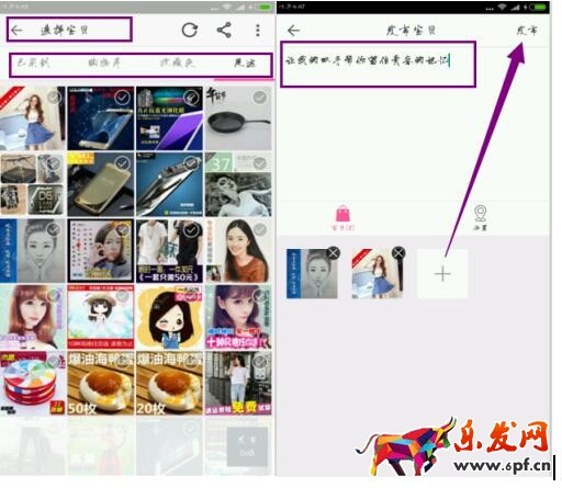 第三步 選好寶貝之后可以點(diǎn)擊發(fā)布 然后填入你分享的理由(內(nèi)容主要以產(chǎn)品賣(mài)點(diǎn)為主也可以復(fù)制整個(gè)標(biāo)題)如上圖右