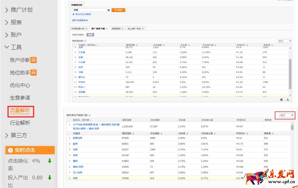 進(jìn)入直通車,在左側(cè)菜單欄有個(gè)工具選項(xiàng),下拉框里有“流量解析”,在這里輸入寶貝的主要關(guān)鍵詞,點(diǎn)擊查詢之后會(huì)有出現(xiàn)一些信息,包括“市場數(shù)據(jù)分析”“推廣詞表下載”“數(shù)據(jù)透視”“線上推廣排名”,添加關(guān)鍵詞時(shí)可以根據(jù)“推廣詞表下載”中“相關(guān)詞分析”和“相關(guān)類目下的熱門詞”提供的關(guān)鍵詞進(jìn)行添加,選擇一些合適的進(jìn)行測試。