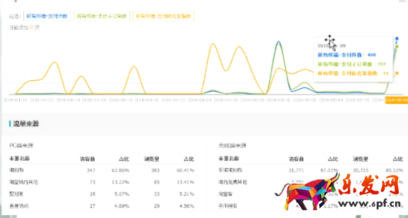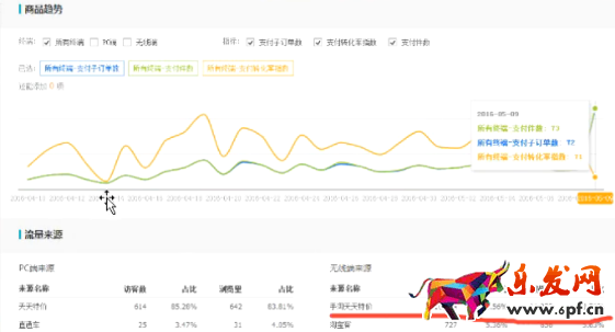 那這是怎么做到的呢?我們可以檢索一下,看這件寶貝的流量后臺。從商品趨勢來看,寶貝一直有在賣,但光在5月9日那天就賣了70多件。再看流量來源,很明顯PC端手機(jī)端天天特價帶來的訪客量和瀏覽量都是很多的,占了百分之七八十。那么我們想一想,如果利用直通車來帶來這么多的流量,是不是得花上幾千了。