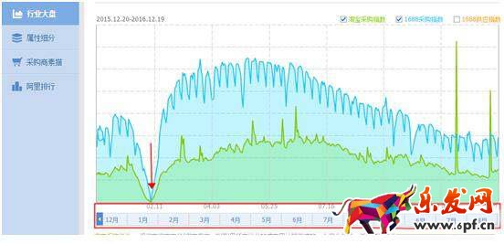 下圖是阿里指數(shù)里,“女春裝”2016年一年的搜索采購指數(shù),我們可以看到,今年是從2.11號左右,采購量開始放大。