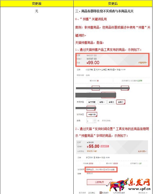 值得一提的是,在《發(fā)布錯(cuò)誤描述信息的規(guī)則與實(shí)施細(xì)則》中,‘’‘預(yù)售‘關(guān)鍵詞亂用”這一條被新列入了“商品標(biāo)題等信息不實(shí)或者與本商品無關(guān)”,并將根據(jù)濫發(fā)信息規(guī)則做扣分及商品處理。