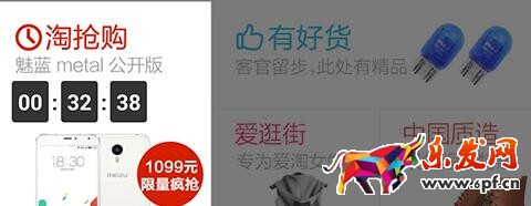 各位商家在報(bào)名參加淘搶購活動(dòng)時(shí),可以額外上傳一張商品素材圖,將有機(jī)會(huì)在手淘首頁的淘搶購業(yè)務(wù)入口展現(xiàn)而獲得超大流量(買家對某個(gè)類型的商品感興趣,就會(huì)推薦在活動(dòng)當(dāng)天上線的相關(guān)商品,千人千面,每個(gè)買家會(huì)看到不同的商品,例如買家對鞋的商品比較感興趣,就會(huì)推薦當(dāng)天鞋類的商品),如下位置: