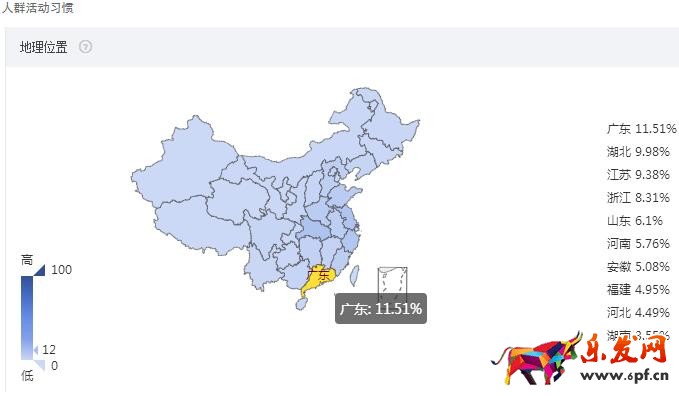 地理位置方面,廣東占比人數(shù)比較多,在11.51%,人群定位地域投放設(shè)置盡量往廣東地區(qū)靠人群活動(dòng)習(xí)慣