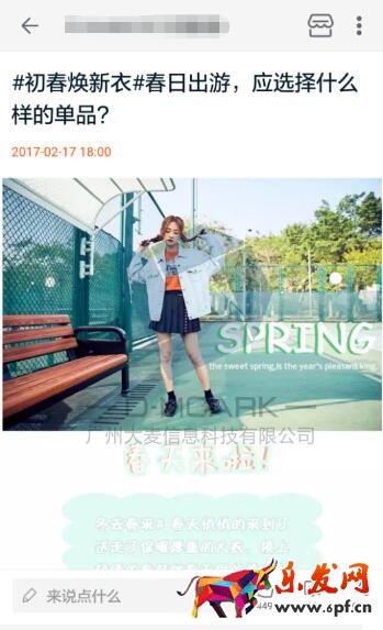 例如這個(gè)店鋪的文案:#初春煥新衣#冬去春來(lái),春天悄悄的來(lái)到了,送走了保暖厚重的大衣,換上輕便的春裝做春天里的美少女啦,先從衣柜開(kāi)始。