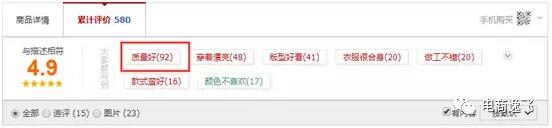 比如這款寶貝,是一款30多塊錢的連衣裙,你可以看到,消費(fèi)者關(guān)注的焦點(diǎn)集中在:版型、是否好看上面,也就是前面說的會關(guān)注款式,關(guān)注啥,你就應(yīng)該在詳情頁當(dāng)中去凸顯啥。再看下面這個(gè):