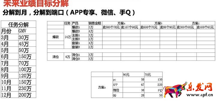 (注:本板塊是最難做的一頁ppt,因為所以的業(yè)績需要分解到單品上,分解到端口銷售數(shù)量上,如果拍腦門亂寫,運營一眼就能看出來,如果存在欺騙手段,可能就適得其反了。)