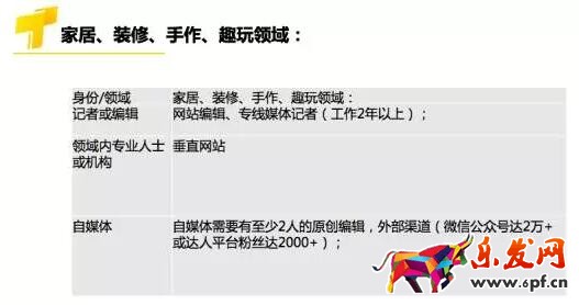 各領(lǐng)域中,身份滿足其一即可申請。淘寶頭條在參考達(dá)人內(nèi)外部粉絲數(shù)的同時(shí),達(dá)人的文章內(nèi)容質(zhì)量也會(huì)作為是否引入的重要標(biāo)準(zhǔn)。