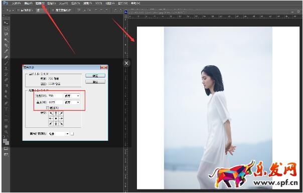豎著的圖片我們要把它變成正方形就稍微有點麻煩,但是這都不是事兒,首先我們要建立一個畫布,這個是在ps最上方的圖層里面可以找到。注意的是要把短的數(shù)據(jù)調(diào)到大的數(shù)據(jù),如圖把750改成1125,這樣就會變成了正方形。