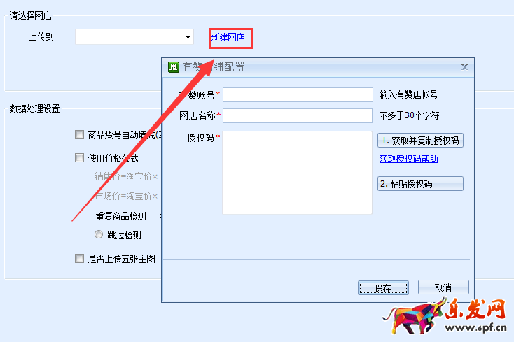 5.數(shù)據(jù)處理設(shè)置,第一次使用的小伙伴在這邊選擇新建網(wǎng)店,輸入你的有贊賬號(hào)和密碼獲取授權(quán)碼。