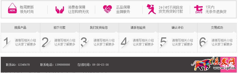 <table border="0" height="74" width="950" cellpadding="0" cellspacing="0"> <tbody> <tr> <td background="http://img04.taobaocdn.com/imgextra/i4/T2aEBHXblbXXXXXXXX-47075529.gif"> <table border="0" height="60" width="950" cellpadding="0" cellspacing="0"> <tbody> <tr> <td width="77"> </td> <td style="font-size:14px;padding-bottom:0px;color:#717171;line-height:18px;padding-top:0px;" width="99"> 每周更新<br /> 領(lǐng)先時尚 </td> <td width="95"> </td> <td style="font-size:14px;padding-bottom:0px;color:#717171;line-height:18px;padding-top:0px;" width="101"> 消費者保障<br /> 讓您購物無憂 </td> <td width="93"> </td> <td style="font-size:14px;padding-bottom:0px;color:#717171;line-height:18px;padding-top:0px;" width="97"> 正品保障<br /> 金牌服務(wù) </td> <td width="74"> </td> <td style="font-size:14px;padding-bottom:0px;color:#717171;line-height:16px;padding-top:0px;" width="109"> 24小時不間斷發(fā)貨支持貨到付款 </td> <td width="80"> </td> <td style="font-size:14px;padding-bottom:0px;color:#717171;line-height:18px;padding-top:0px;" width="107"> 7天內(nèi)<br /> 無條件退換貨 </td> <td width="18"> </td> </tr> </tbody> </table> </td> </tr> </tbody> </table> <table border="0" height="10" width="950" cellpadding="0" cellspacing="0"> <tbody> <tr> <td> </td> </tr> </tbody> </table> <table border="0" height="120" width="950" cellpadding="0" cellspacing="0"> <tbody> <tr> <td background="http://img03.taobaocdn.com/imgextra/i3/T28UxHXbpbXXXXXXXX-47075529.gif"> <table border="0" height="120" width="950" cellpadding="0" cellspacing="0"> <tbody> <tr> <td style="font-size:12px;padding-bottom:0px;color:#414141;line-height:14px;padding-top:0px;" align="center" height="39" width="158"> 挑擇產(chǎn)品 </td> <td style="font-size:12px;padding-bottom:0px;color:#414141;line-height:14px;padding-top:0px;" align="center" width="158"> 拍下付款 </td> <td style="font-size:12px;padding-bottom:0px;color:#414141;line-height:14px;padding-top:0px;" align="center" width="158"> 我們發(fā)貨給您 </td> <td style="font-size:12px;padding-bottom:0px;color:#414141;line-height:14px;padding-top:0px;" align="center" width="158"> 請拆包驗貨 </td> <td style="font-size:12px;padding-bottom:0px;color:#414141;line-height:14px;padding-top:0px;" align="center" width="158"> 確認(rèn)評價 </td> <td style="font-size:12px;padding-bottom:0px;color:#414141;line-height:14px;padding-top:0px;" align="center" width="158"> 交易成功 </td> </tr> <tr> <td height="80"> <table border="0" height="60" width="158" cellpadding="0" cellspacing="0"> <tbody> <tr> <td width="60"> </td> <td style="font-size:12px;padding-bottom:0px;color:#868686;line-height:16px;padding-top:0px;" width="85"> 請?zhí)顚懴嚓P(guān)介紹讓買家了解更多 </td> <td width="13"> </td> </tr> </tbody> </table> </td> <td> <table border="0" height="60" width="158" cellpadding="0" cellspacing="0"> <tbody> <tr> <td width="60"> </td> <td style="font-size:12px;padding-bottom:0px;color:#868686;line-height:16px;padding-top:0px;" width="85"> 請?zhí)顚懴嚓P(guān)介紹讓買家了解更多 </td> <td width="13"> </td> </tr> </tbody> </table> </td> <td> <table border="0" height="60" width="158" cellpadding="0" cellspacing="0"> <tbody> <tr> <td width="60"> </td> <td style="font-size:12px;padding-bottom:0px;color:#868686;line-height:16px;padding-top:0px;" width="85"> 請?zhí)顚懴嚓P(guān)介紹讓買家了解更多 </td> <td width="13"> </td> </tr> </tbody> </table> </td> <td> <table border="0" height="60" width="158" cellpadding="0" cellspacing="0"> <tbody> <tr> <td width="60"> </td> <td style="font-size:12px;padding-bottom:0px;color:#868686;line-height:16px;padding-top:0px;" width="85"> 請?zhí)顚懴嚓P(guān)介紹讓買家了解更多 </td> <td width="13"> </td> </tr> </tbody> </table> </td> <td> <table border="0" height="60" width="158" cellpadding="0" cellspacing="0"> <tbody> <tr> <td width="60"> </td> <td style="font-size:12px;padding-bottom:0px;color:#868686;line-height:16px;padding-top:0px;" width="85"> 請?zhí)顚懴嚓P(guān)介紹讓買家了解更多 </td> <td width="13"> </td> </tr> </tbody> </table> </td> <td> <table border="0" height="60" width="158" cellpadding="0" cellspacing="0"> <tbody> <tr> <td width="60"> </td> <td style="font-size:12px;padding-bottom:0px;color:#868686;line-height:16px;padding-top:0px;" width="85"> 請?zhí)顚懴嚓P(guān)介紹讓買家了解更多 </td> <td width="13"> </td> </tr> </tbody> </table> </td> </tr> </tbody> </table> </td> </tr> </tbody> </table> <table border="0" height="10" width="950" cellpadding="0" cellspacing="0"> <tbody> <tr> <td> </td> </tr> </tbody> </table> <table border="0" height="64" width="950" cellpadding="0" cellspacing="0"> <tbody> <tr> <td background="http://img02.taobaocdn.com/imgextra/i2/T2zUBHXaJbXXXXXXXX-47075529.gif"> <table border="0" height="30" width="950" cellpadding="0" cellspacing="0"> <tbody> <tr> <td width="21"> </td> <td style="font-size:12px;padding-bottom:0px;color:#<b style="color=#ffffff ; font-weight:bload;"line-height:16px;padding-top:0px;" width="863"> 聯(lián)系QQ:12345678 聯(lián)系電話:1398888888 在線時間:09:00-23:00</td> <td width="66"> </td> </tr> </tbody> </table> </td> </tr> </tbody> </table>