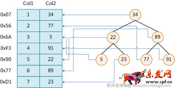 上圖展示了一種可能的索引方式。左邊是數(shù)據(jù)表,一共有兩列七條記錄,最左邊的是數(shù)據(jù)記錄的物理地址(注意邏輯上相鄰的記錄在磁盤(pán)上也并不是一定物理相鄰的)。為了加快Col2的查找,可以維護(hù)一個(gè)右邊所示的二叉查找樹(shù),每個(gè)節(jié)點(diǎn)分別包含索引鍵值和一個(gè)指向?qū)?yīng)數(shù)據(jù)記錄物理地址的指針,這樣就可以運(yùn)用二叉查找在O(log2n)的復(fù)雜度內(nèi)獲取到相應(yīng)數(shù)據(jù)。