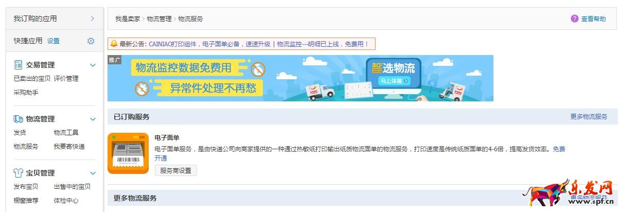 淘寶店鋪打印菜鳥電子面單,就需要登陸淘寶店鋪去申請(qǐng)開通,只要一個(gè)店鋪申請(qǐng)下來(lái)之后,所有的訂單都能用,不區(qū)分平臺(tái)、店鋪,訂單種類。首先登錄淘寶賣家中心,找到左側(cè)菜單中的【物流管理】→點(diǎn)擊【物流服務(wù)】,找到電子面單運(yùn)營(yíng)商申請(qǐng)頁(yè)面,如下: