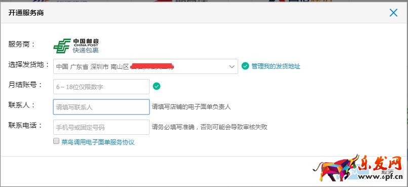 按要求填寫相關(guān)信息,選擇發(fā)貨地址、月結(jié)賬號(hào)、填寫聯(lián)系人信息,確認(rèn)無(wú)誤后提交。