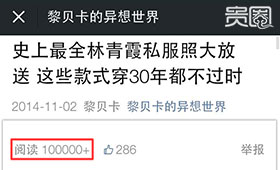對(duì)不少微信公眾號(hào)而言,吸引用戶往往需要漫長(zhǎng)的等待,但“黎貝卡”一下子就打破了這條規(guī)律:第一篇文章閱讀數(shù)突破了一千,第二篇成功翻倍,第三篇“談林青霞的穿衣之道”,累積點(diǎn)擊率超過了10萬。此后,“黎貝卡”愈戰(zhàn)愈勇,只用了短短七個(gè)月時(shí)間,粉絲就積累到了26萬。