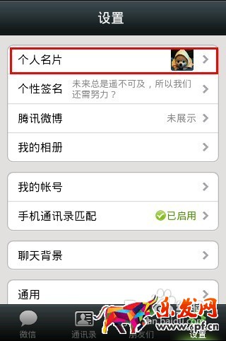 然后退出到微信主界面,然后依次選擇“設(shè)置,個(gè)人名片”: