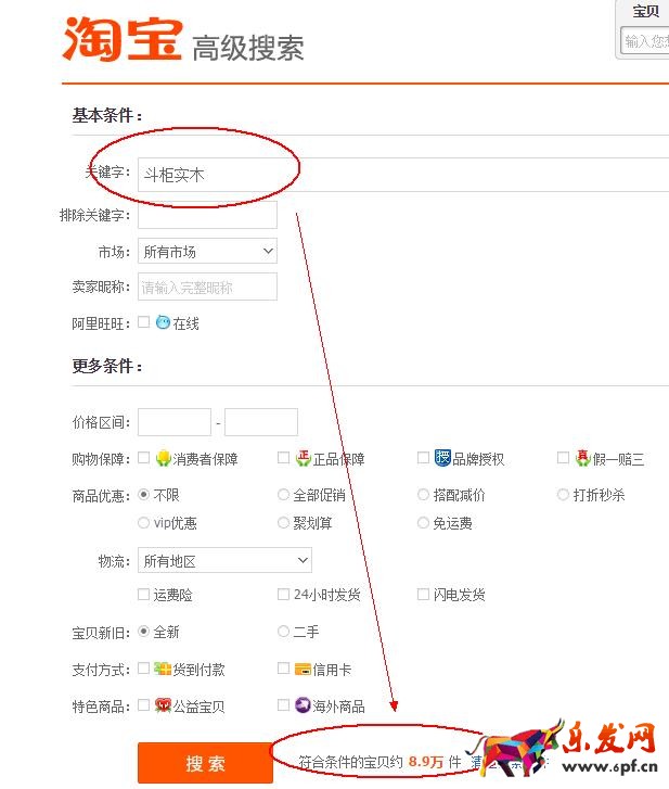 第二步在淘寶首頁打開商品分類,里面有高級搜索,打開高級搜索,輸入斗柜實(shí)木。我們可以看到有8.9萬的寶貝,也就是8.9萬的競爭。