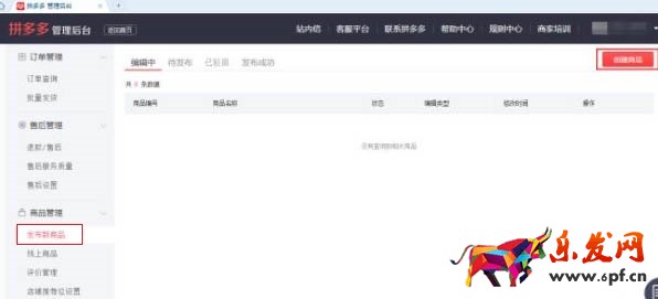 找到左側(cè)菜單欄中的【發(fā)布新商品】,找到該頁面右上角的【創(chuàng)建商品】,點(diǎn)擊。