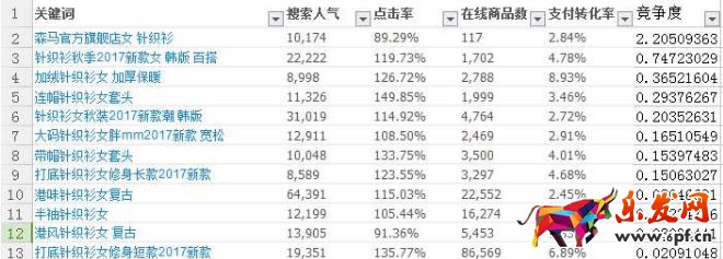 之后就將找到的詞都收集到excel表格里,然后根據(jù)這樣一個(gè)公式:競爭度=搜索人氣*點(diǎn)擊率*轉(zhuǎn)化率/在線商品數(shù),去判斷每個(gè)關(guān)鍵詞的競爭度,然后按降序排列,選擇精準(zhǔn)度高的詞使用,可以讓寶貝搜索排名更靠前,轉(zhuǎn)化更高。