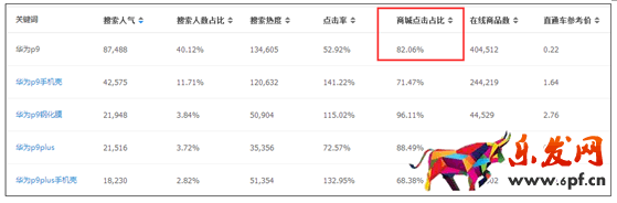 我們大家看這個(gè)數(shù)據(jù),這個(gè)“華為P9”關(guān)鍵詞,商城點(diǎn)擊占比是82.6%,什么意思呢?就是說,有絕大部分的流量都被天貓店鋪分走了。那么,如果你是一個(gè)淘寶店鋪的話,這個(gè)關(guān)鍵詞對你來說,就不應(yīng)該是重點(diǎn)競爭的,當(dāng)然并不是說你標(biāo)題中不能用,而是說你去競爭這個(gè)詞,需要付出的努力,比天貓店鋪要大得多。相反,如果你是一個(gè)天貓店鋪,那么這就是一個(gè)好詞,然后我們看第三個(gè)詞,“華為P9鋼化膜”,96.11%的商城點(diǎn)擊占比,這個(gè)詞就更好了。