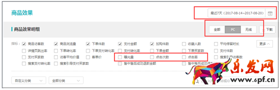 打開你的生意參謀——商品——商品效果——最近7天的數(shù)據(jù),然后看PC端的數(shù)據(jù)(當(dāng)然,你會(huì)告訴我,現(xiàn)在誰(shuí)還看PC端的數(shù)據(jù),都看無(wú)線端了好不好,但是你要注意,目前生意參謀無(wú)法把曝光量、點(diǎn)擊次數(shù)這些數(shù)據(jù)表現(xiàn)出來(lái),并且從整體效果上來(lái)看,你探查的是點(diǎn)擊率,這是有一定的代表性的)