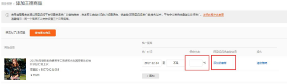剛才在新建計(jì)劃是設(shè)置的類目傭金,點(diǎn)擊進(jìn)入到剛才新建的計(jì)劃后,可以添加主推商品,也就是說我想讓淘客主推某個(gè)商品,這個(gè)商品的傭金比類目傭金要高時(shí),可以添加主推商品。