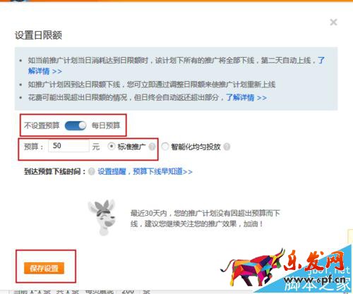 6、進入活動編輯頁面,點擊【設(shè)置日限額】,點擊【每日預(yù)算】,在窗口中填寫你要設(shè)置的限額,點擊【保存設(shè)置即可】。