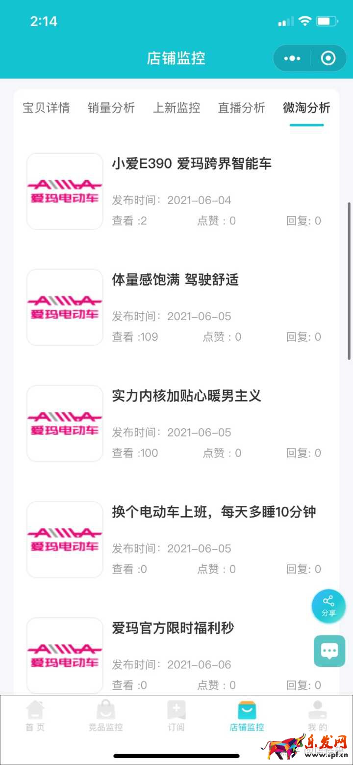 微淘分析,這個就可以分析店鋪的最新微淘發(fā)布情況,如果你也在做微淘的內(nèi)容營銷,可以根據(jù)這個數(shù)據(jù)追蹤對手發(fā)微淘的數(shù)據(jù)。
