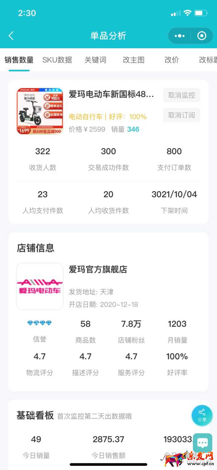 例如這個愛瑪電動車的數(shù)據(jù),包括收貨人數(shù)、交易成功件數(shù)、支付訂單數(shù)、人均支付件數(shù)、人均收貨件數(shù)、下架時間等等,這些數(shù)據(jù)都是可以直接一鍵透視的。