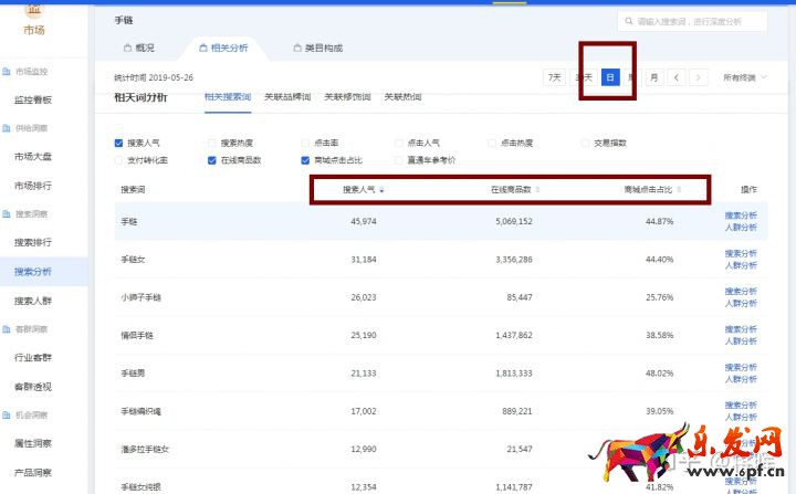 4)例如,輸入“手鏈”,會(huì)出現(xiàn)一連串的數(shù)據(jù),其中搜索人氣,就是此關(guān)鍵詞的搜索量,另外,還要關(guān)注在線商品數(shù)和商城點(diǎn)擊占比這兩個(gè)維度的數(shù)據(jù)。