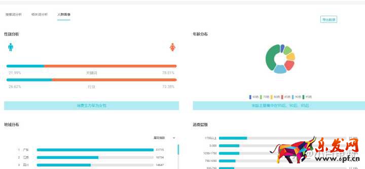 還有相符的人群畫像更清晰分辨該詞下的人群、性別、年齡、地域分布、人群組合、消費(fèi)層級(jí)