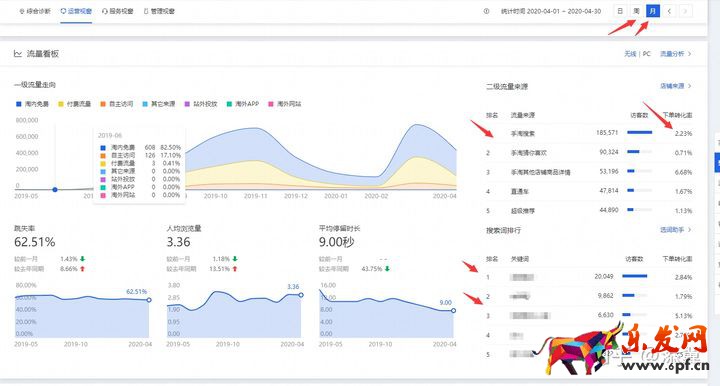這里數(shù)據(jù)可以選擇 一天 ,一周 ,或者 一個(gè)月 ,通過(guò)一段時(shí)間了解店鋪的經(jīng)營(yíng)狀況。一級(jí)流量結(jié)構(gòu)級(jí)比重,淘內(nèi)免費(fèi)流量的占比60% 我們說(shuō)都是健康的,