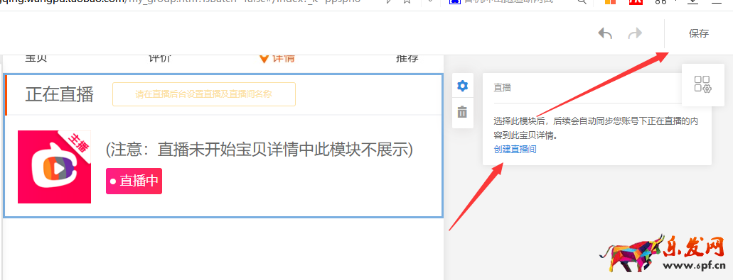 最后,我們選擇點(diǎn)擊直播模塊,就可以看到寶貝詳情頁預(yù)覽圖中添加了這個(gè)模塊,點(diǎn)擊右邊的創(chuàng)建直播間,就可以添加直播了,操作好保存即可。