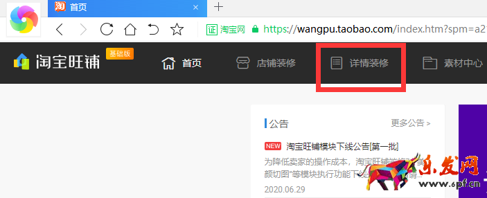 首先,打開官方淘寶旺鋪界面,找到并點(diǎn)擊進(jìn)入【詳情裝修】欄目