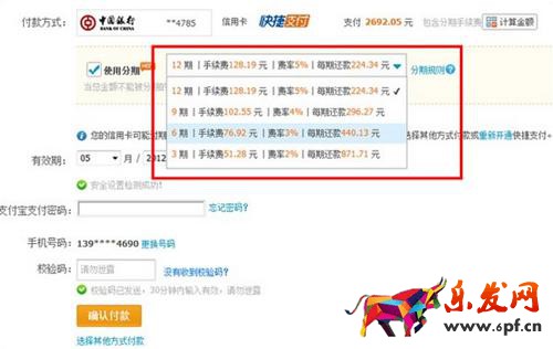 中國銀行淘寶分期付款手續(xù)費:3期2%,6期3%,9期4%,12期5%;