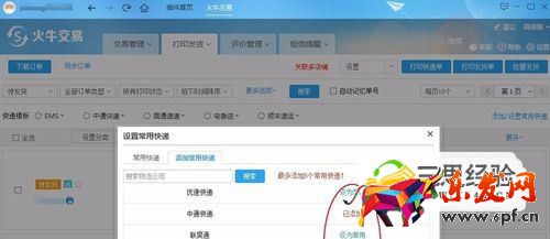 通過千牛插件進入軟件,點擊上方的“批量打印發(fā)貨”里面點擊“添加/設(shè)置常用快遞”按鈕進入設(shè)置界面。