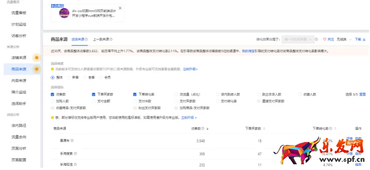 ③分析商品的流量:訪客、轉(zhuǎn)化;如果從產(chǎn)品的訪客流量上可以看出流量是增長的狀態(tài)而轉(zhuǎn)化不高的話,這個產(chǎn)品慢慢就沒有流量了。商品來源>進店來源>上一跳來源;整體、新客、老客、會員等;