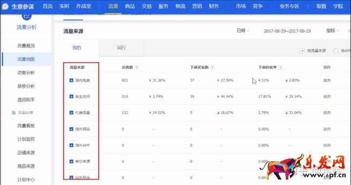 首先,我們要去把昨天或者上周同期數(shù)據(jù)調(diào)出來,看看里面所有的流量渠道,究竟哪一個渠道訪客波動比較大。操作步驟:打開生意參謀→流量→流量分析→流量地圖→選擇指定日期