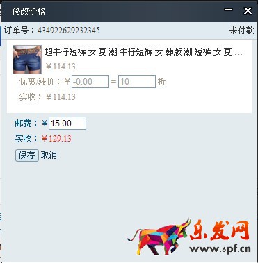 【改價】點擊如上圖的“改價”按鈕對訂單漲價或折扣,還可修改運費。