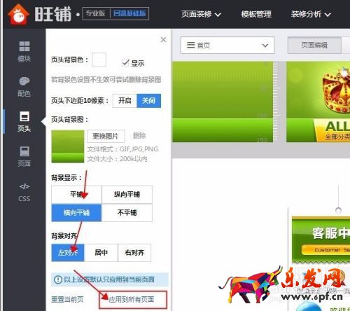 ?3 設(shè)置背景顯示選擇橫向平鋪,設(shè)置背景對齊選擇左對齊,最后記得點(diǎn)擊應(yīng)用到所有頁面。