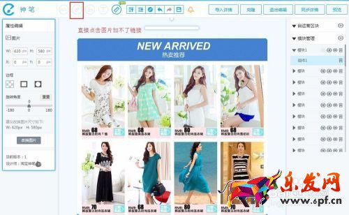 注意第七步:7、(重點)加入鏈接技巧,默認(rèn)點擊圖片是無法加入鏈接的,需要把圖片移動一點位置,可以向上移動一下圖片,然后在空白處點擊,這時候左上角就出現(xiàn)了可以加鏈接,點擊鏈接直接選擇你需要的寶貝,可以添加多個鏈接,然后把熱點框的大小改變到合適大小。